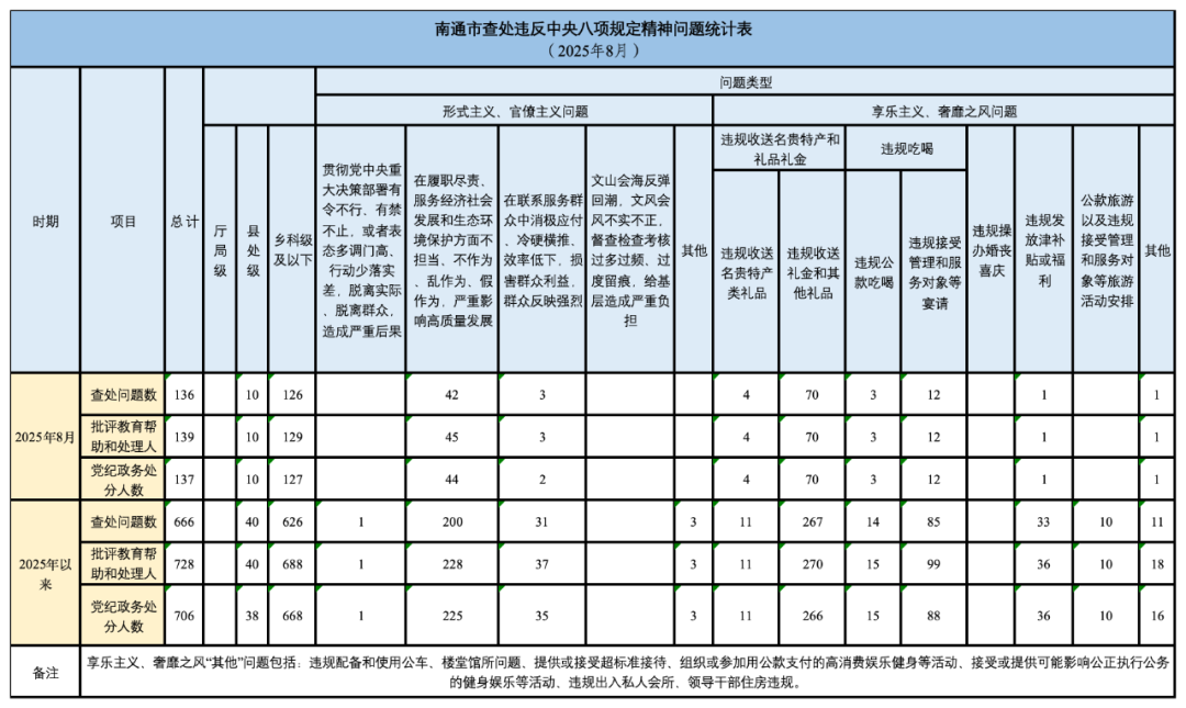 2025年8月南通市查处违反中央八项规定精神问题136起